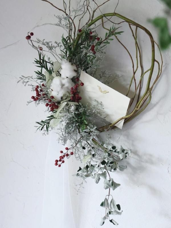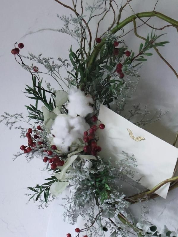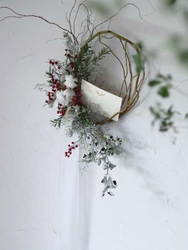 シルバー&ホワイトリーフと真っ赤なノイバラの実をアレンジした蔓リースに、オーナメントキャンドル、文字入りのリボン、クリスマスカードを添えて飾っていただきます。(お持ち帰りお菓子付き)